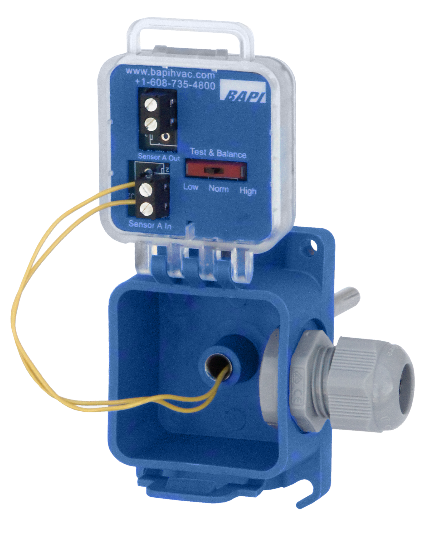 Kanal-Temperatursensor, 1K Platinum RTD (385 Kurve), 200mm Fühler, BAPI-Box Crossover Gehäuse (PT1000), Test & Balance-Schalter